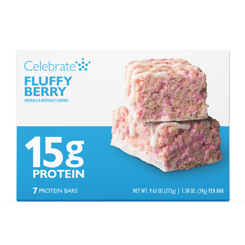 Celebrate's bariatric Protein Bars provide 15 g of high-quality protein. Each bar also contains fiber, has a calorie range of 130-160, and a net carbohydrate range between 14-17 g. Bars are available in 6 flavours (Salted Toffee Pretzel, Chocolate Crisp, Fluffy Lemon, Fluffy Nutter, Fluffy Choco Vanilla Crisp and Fluffy Berry).