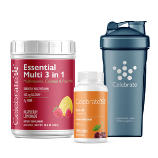 Congratulations on the beginning of your weight loss journey! This bariatric post-op starter kit will provide all of the vitamins/minerals and protein needed for a bit longerafter surgery; Our Celebrate Essential Multi 3 in 1 drink mix contains a robust multivitamin, calcium citrate, and soluble fiber along with 500 mg of an antioxidant blend with added electrolytes. Our blender bottle helps make mixing shakes simple and easy since our bottles have ounce markings on the side so you can track your fluids. And also 45 mg of calcium you can choose as chewable or softchew. All products in this set are also available separately under the respective nutrient section.